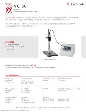 SONICS 超聲波破碎儀 VC 50:是一款小型緊湊的50瓦超聲波處理器??梢杂檬治兆√筋^,轉(zhuǎn)動(dòng)前面板上的振幅旋鈕即可激活超聲波能量。包括1/8“探頭(0.5–15mL體積),并提供各種配件,用于各種應(yīng)用和樣品體積。
