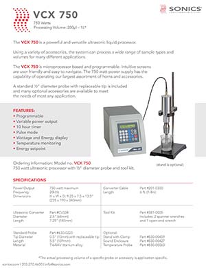 SONICS超聲波液體處理器 VCX750,可安全處理各種有機(jī)和無機(jī)材料,從250微升升至1升*。典型應(yīng)用包括納米技術(shù)(生產(chǎn)納米顆粒材料和石墨烯分散體),細(xì)胞裂解,樣品制備,均質(zhì)化,ChIP測定,乳化,解聚和解聚,以及聲化學(xué)液體處理領(lǐng)域的應(yīng)用。