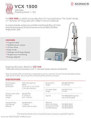 SONICS超聲波分散器 VCX1500,1500W超聲波處理器和設(shè)備,可以批量安裝多達20升的有機和無機材料。典型應(yīng)用包括工業(yè)混合(包括納米材料的大規(guī)模加工)和工業(yè)加工(包括乳化,脫氣和大規(guī)模分散體系)。